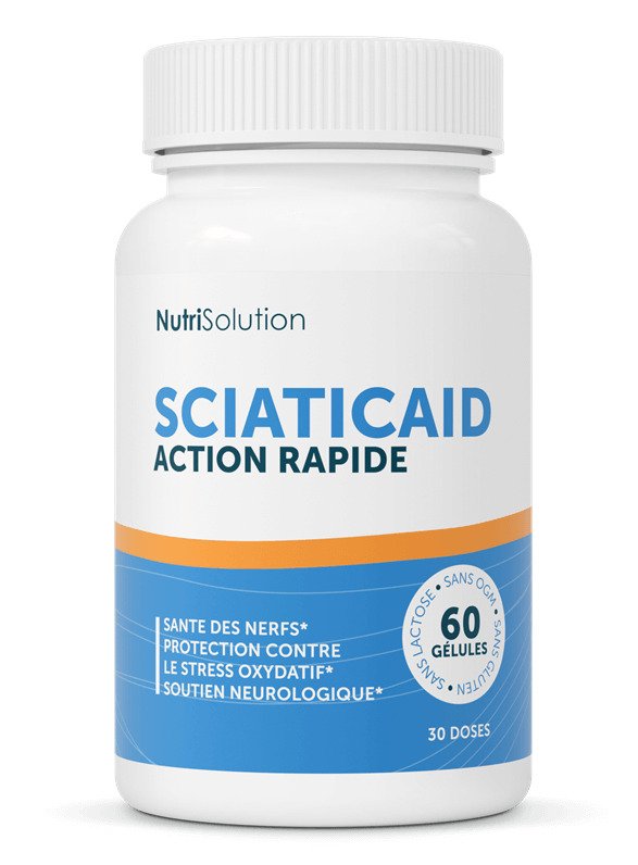 SciaticAid est un complément alimentaire en gélules végétales HPMC commercialisé par le laboratoire français NutriSolution. La formule à 9 actifs combine 5 vitamines B sous formes bioactives, deux composants nutritionnels (PEA, acétyl-L-carnitine) et deux plantes traditionnelles (scutellaire, passiflore). Conception en France, fabrication européenne, posologie simple de 2 gélules par jour avec un grand verre d’eau le matin.